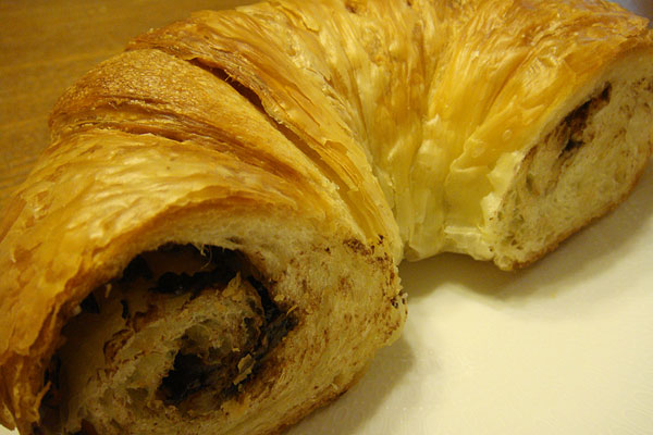 発売当初から結構気に入っています。リング型のパンなのですが、半分サイズも売っています。リングのまま買うと1000円ちょっと、半分サイズで500円ちょっと。流石に1000円ちょっと払うのは大胆だなと言う人には是非半分サイズ。いや500円でも十分高いと思うので、滅多に買わないんですけどね。中身はチョコと胡桃です。チョコが入り過ぎないので、甘いけど結構食べられてしまいます。周りはパイ生地のようにさくさく。中はもっちりなのです。美味いんだぜー。